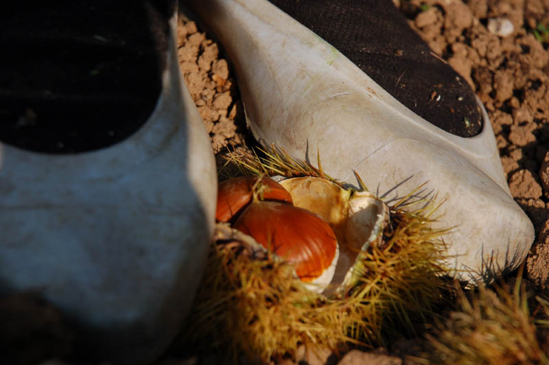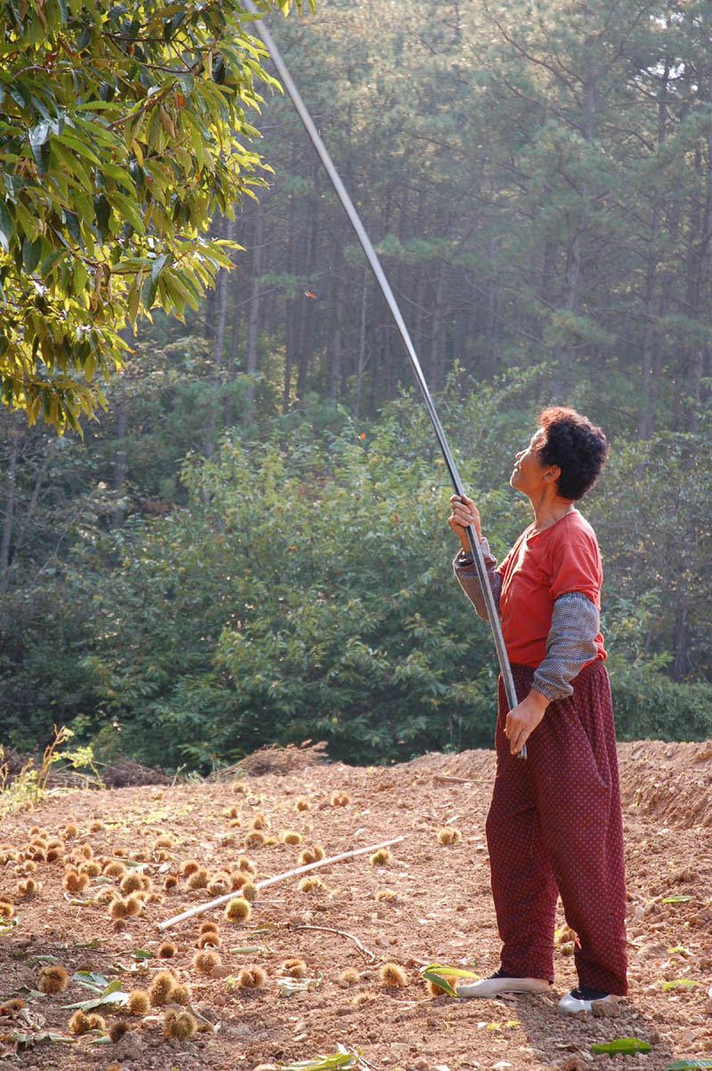 떨어진 밤을 줍는 것만으로 성이 차지 않았나보다. 임동떡이 알루미늄 막대를 들고 밤을 치기 시작한다. ‘후둑두’ 소리를 내면 한 무더기의 밤이 쏟아진다. 그러자 임동떡은 막대를 내려놓고 껍질이 다 벗겨지지 않은 밤송이를 고무신 사이에 넣고 익숙한 솜씨로 밤을 깐다. 한쪽발로 밤을 잡고 다른 한발로 밤을 까는 것 같다. 그러더니 작은 나무 막대를 도구로 사용해 밤을 깐다. 거침이 없다. 하루아침에 다져진 솜씨는 아니겠지만 혀를 내두를만한 솜씨다.