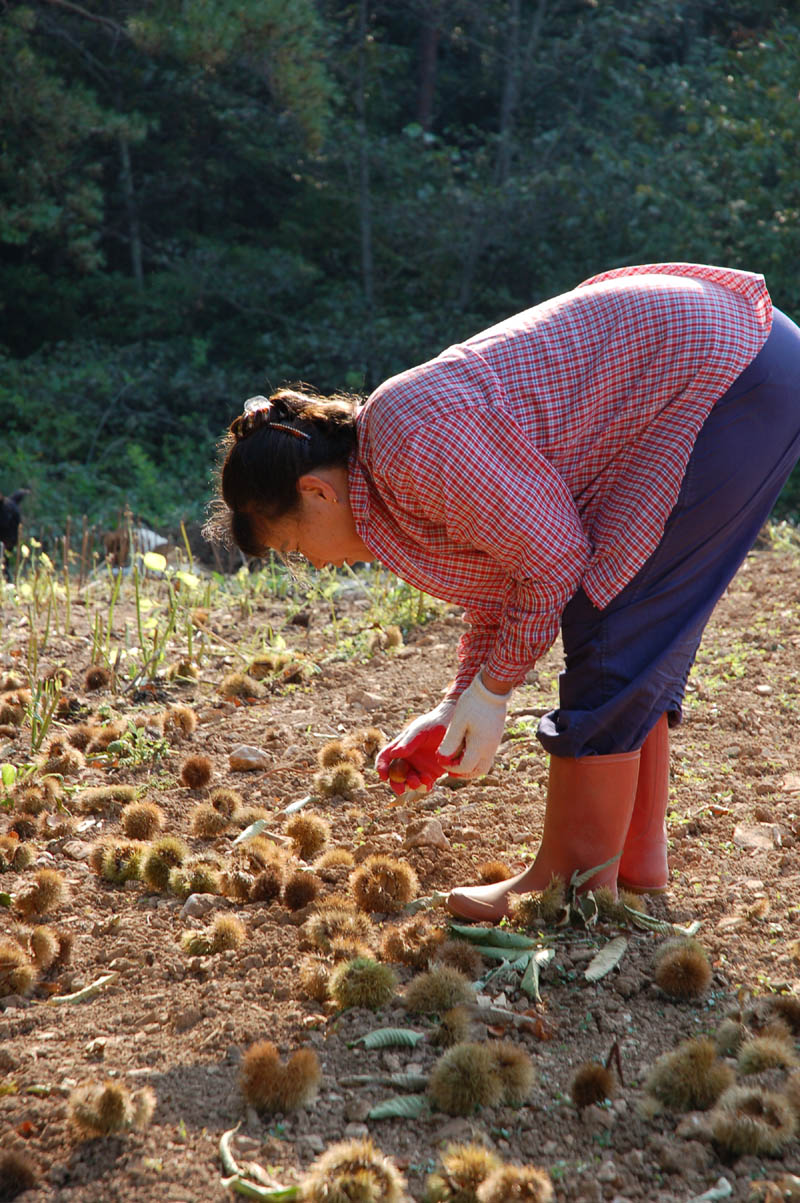 피사체가 되기에 참 좋은 밤송이다. 이리저리 방향을 바꿔가며 셔터를 눌러댔다. 그동안 임동떡이나 수연씨 모두 밤 줍는데 익숙해진 것 같다. 그래도 임동떡 만큼 밤을 잘 줍는 사람은 없었다. 이것도 다 연륜인가 보다.밤을 따고 있는 수연씨 어깨 너머로 비치는 부드러운 가을 햇살이 한 폭의 그림을 그려낸다. ‘밀레의 만종“은 못되더라도 ’백자골 밤따는 아낙‘은 되지 않을까.