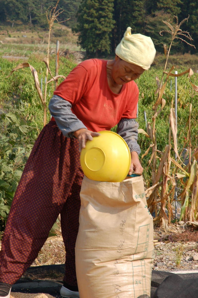 어제 병갑씨의 아이들로 부터 백자골 가까운 곳에 토실토실 익은 알밤이 있다는 정보를 얻었다. 나는 자연산 밤과 밤나무 사진이 필요했다. 산과 들에서 나는 곡식이며 과일 사진을 모두 찍었는데 밤 사진은 아직 찍지 못했다. 그래서 ‘오늘이 기회다’라는 생각으로 백자골을 방문한 것이다. 그런데 아이들이 올 시간이 멀었단다. 오늘은 오후 5시가 넘어야 아이들에 집에 올 수 있단다. 그 때쯤이면 해가 기울어 촬영이 불가능하다. 아이들이 있으면 그 모습을 담으면 더 예쁜고 감동적인 사진이 나올텐데.... 하지만 어쩌라. 아이들 대신 조금 한가한 수연씨가 동행해 주기로 했다.다시 마을로 돌아오자 병갑씨 집 그리 멀지 않은 곳에서 임동떡(댁)이 벼들 담고 있다. 수연씨는 다짜고짜 임동떡에게 가더니 “아짐 우리 밤따러 갑시다” 하고 채근한다. 임동떡은 별 거부 반응 없이 수연씨를 따라나섰다. 나중에 안 얘기지만 두 집안 사이에는 내가 모르는 밀약이 있단다. 그런데 대외비라니 더 이상 관심 갖지 않기로 했다.