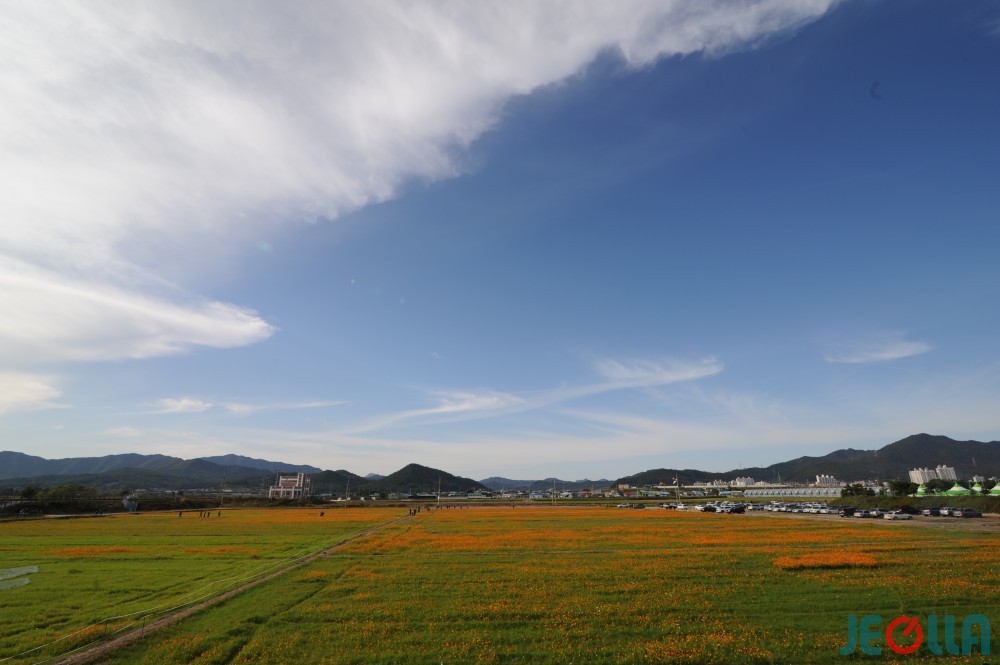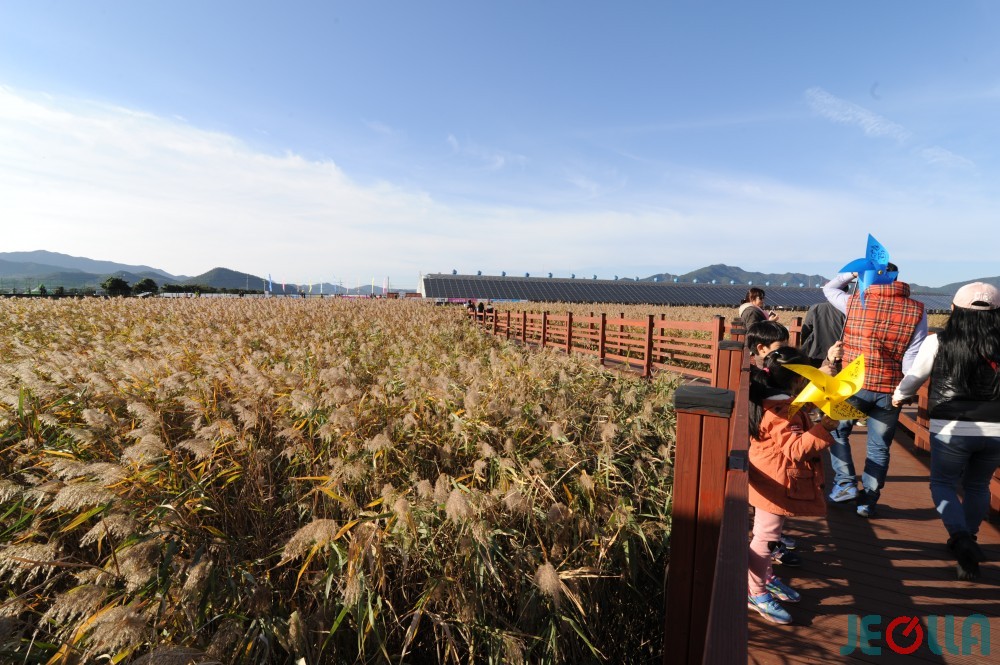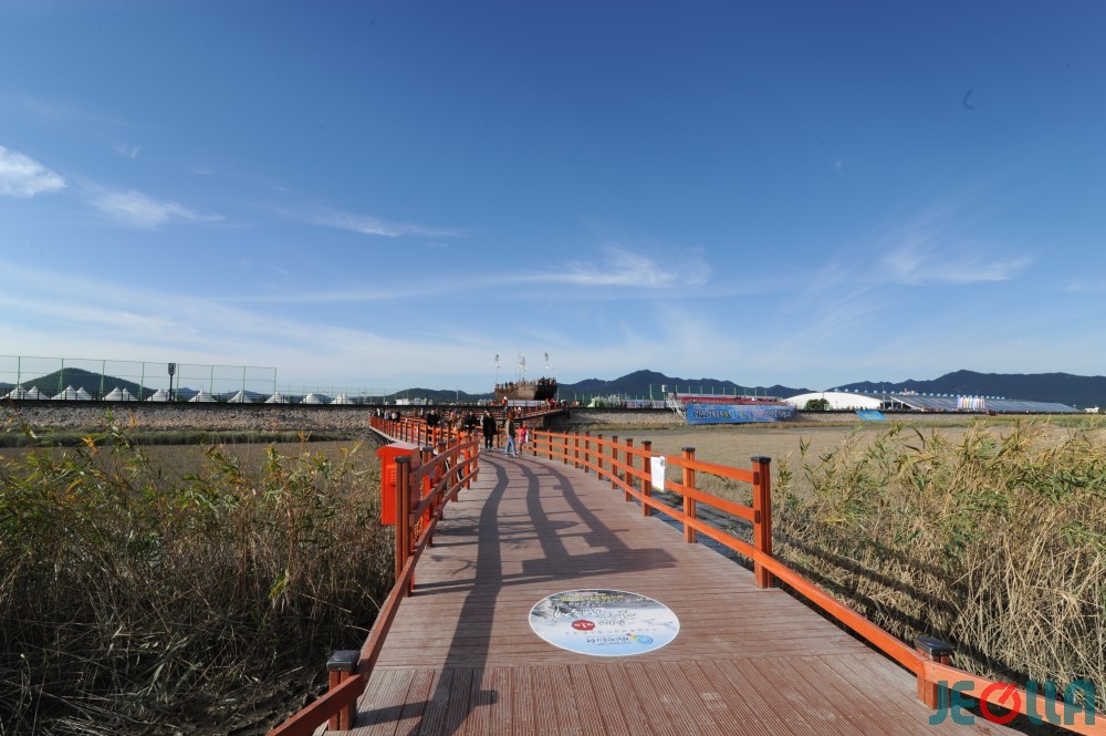 ‘제1회 춤추는 강진만 갈대축제’가 열리던 10월 30일은 높고 파란 하늘에 스프레이를 뿌려놓은 듯한 하얀 구름이 가을 나그네의 마음을 미치도록 흔드는 날이었다. 주무대에서는 통기타 선율에 맞춰 귀에 익은 포크송이 연신 연주되고, 황하코스모스가 피어있는 넓은 밭자락에서는 한 소녀가 셀피에 열중이었다. 몇몇 사람들은 범선 위에 올라 강진만 갈대숲을 바라보거나 폰카에 자신의 얼굴과 갈대숲 장면을 담기에 바빴다. 갈대숲 탐색을 마친 이들은 갈대숲을 연결한 탐방로는 따라 갈대숲을 향해 나아갔고, 탐진강을 건너지르는 부잔교를 건너 고니상이 서있는 강둑에서 기념사진을 촬영하기도 했다. 이날 갈대축제를 찾은 이들의 대부분은 이 코스를 왕복하는 것에 그쳤다.