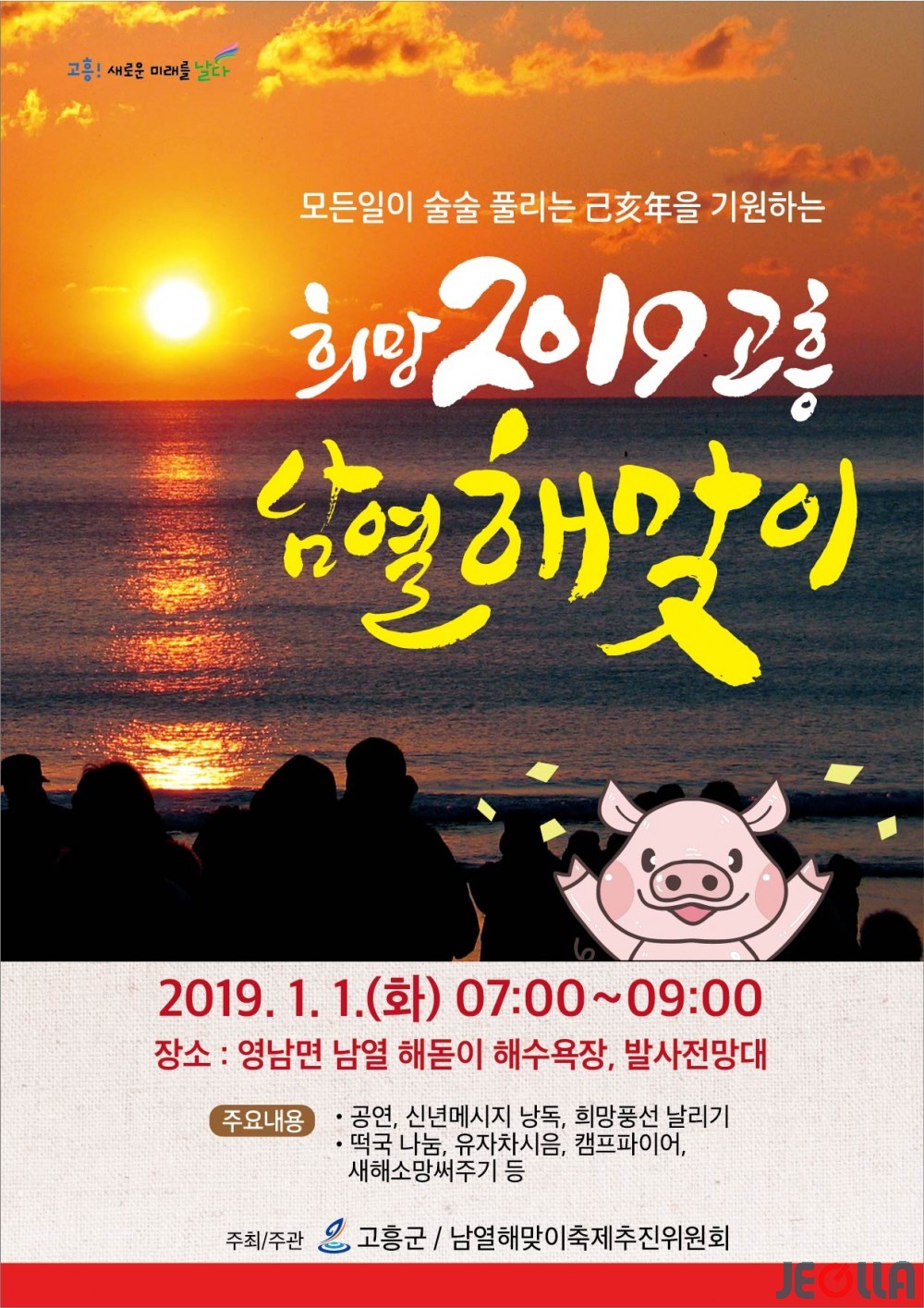 고흥군(군수 송귀근)은 오는 1월 1일(화) 영남면 남열 해돋이 해수욕장에서 관광객과 군민이 새 출발․새 각오를 다짐하고, 소망과 행복을 기원하는 ′2019 새해 고흥 남열 해맞이 행사′를 개최한다고 밝혔다.