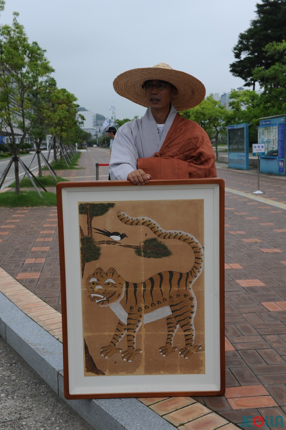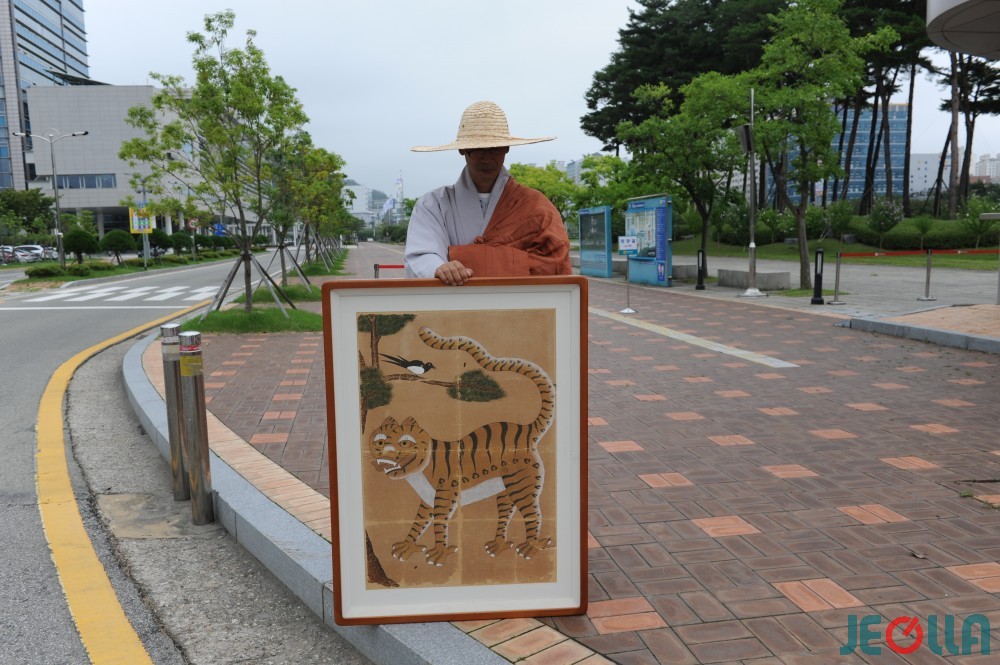 • 22일, 화순군 도곡면 석천사 모 스님이 호랑이와 까치가 그려진 표구 한 점을 앞에 두고 전남도청 입구에서 침묵 시위를 벌이고 있다.