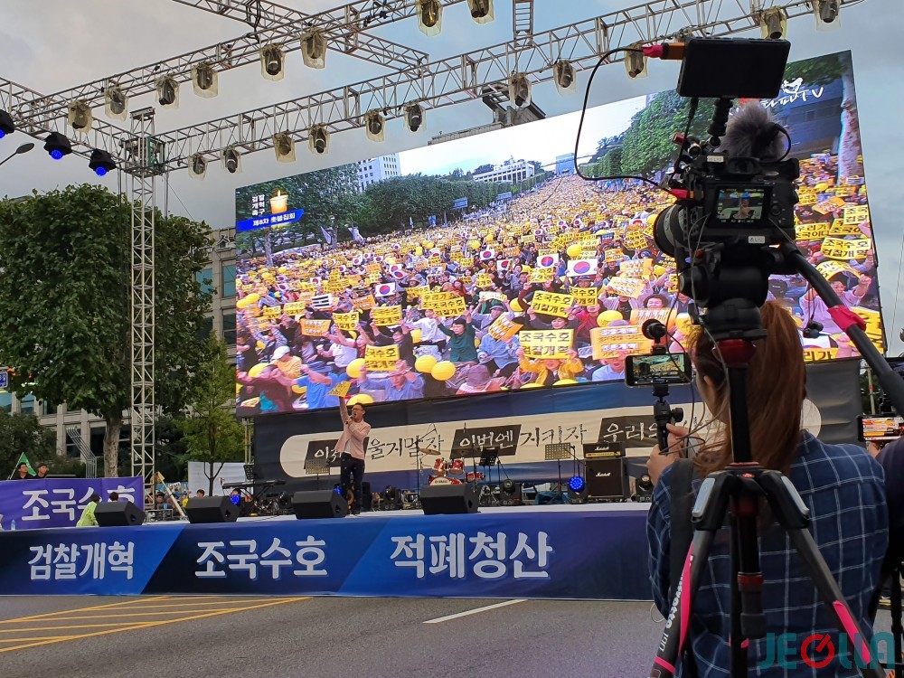 집회가 열리던 시각, 집회장에 서울중앙지검에서 정경심교수의 조사가 이뤄지고 있다는 소식이 전해졌다. 집회현장이 들썩거렸다. 검찰 개혁을 연호하는 구호는 더 커졌고, 대검찰청을 향해 야유의 함성은 서초동을 울렸다.