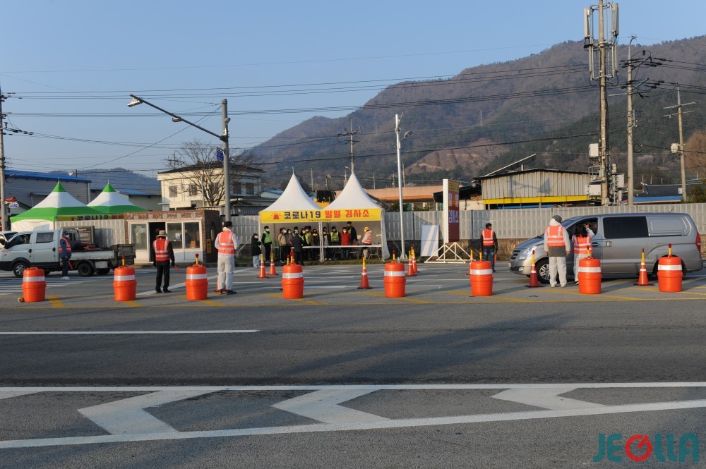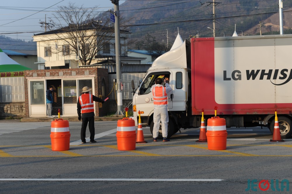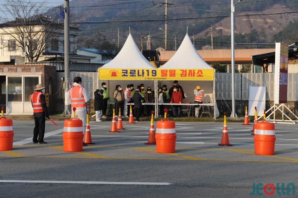 지난 4일 오전 7시경, 공룡대로를 통해 해남읍으로 들어오는 관문인 영신마을 인근 편도 2차선 도로에서 해남군 직원들이 코로나19 발열검사를 실시하고 있다.