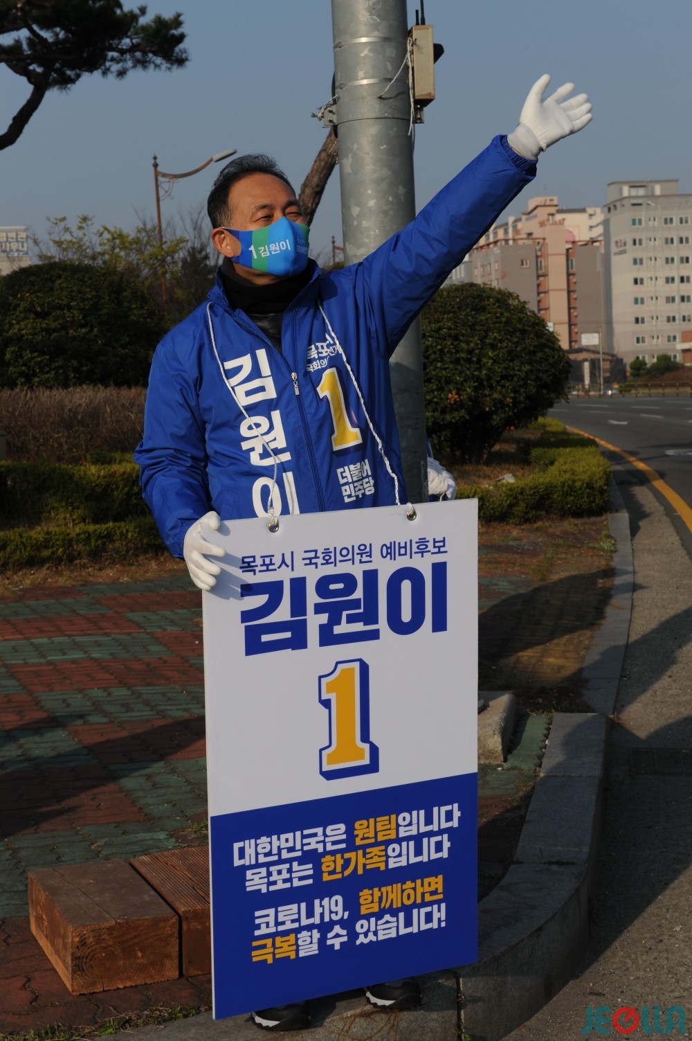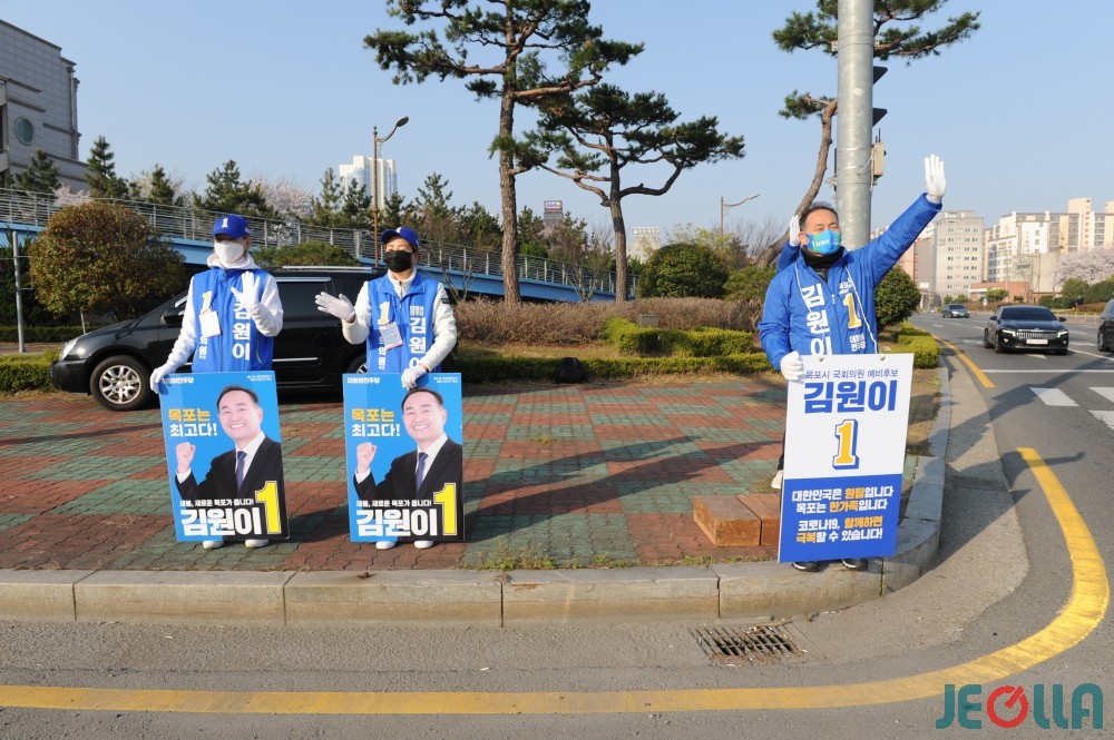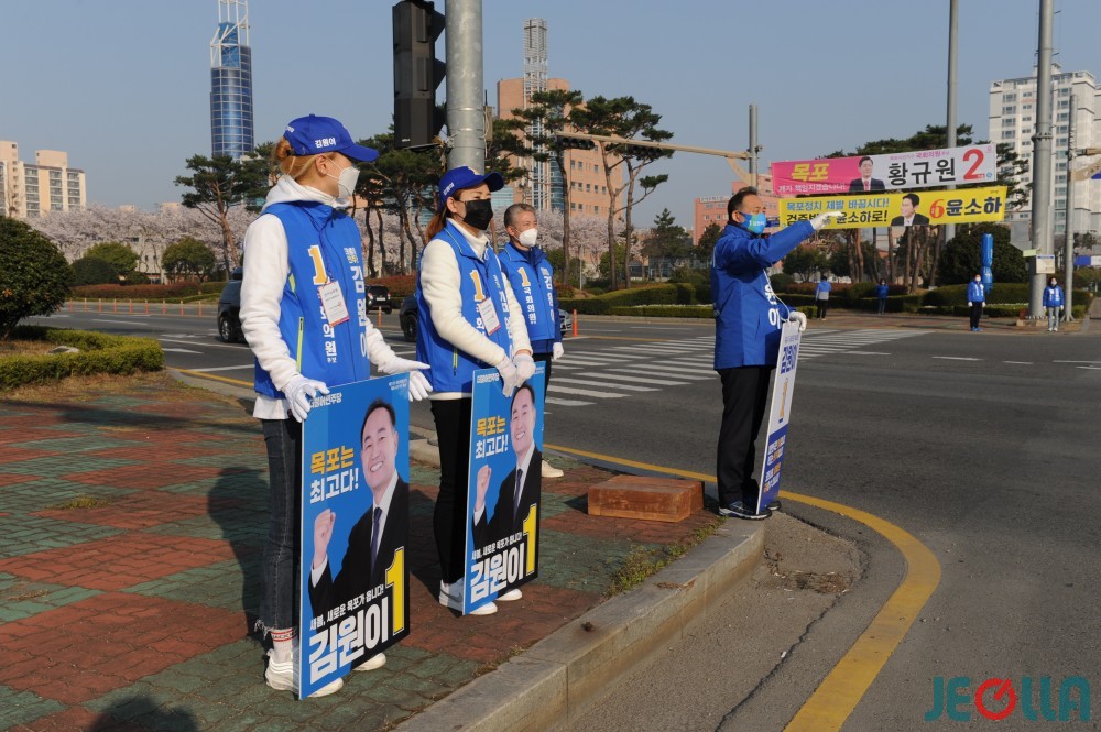 4일, 목포 김원이 더불어민주당 후보가 25호광장교차로에서 이곳을 지나는 시민들을 향해 인사를 하고 있다.