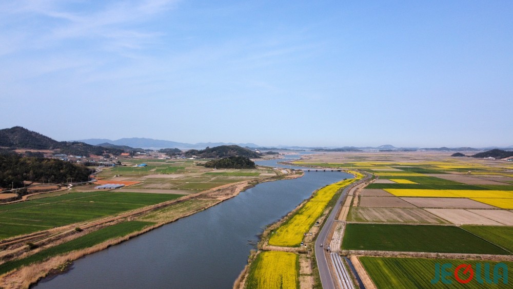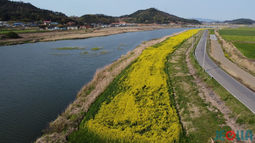 삼산천 둔치에도, 고천암 농경지에도 온통 유채꽃이다. 유채 꽃밭은 삼산천 둔치를 따라 10여 리 넘게 길게 이어지고 있으며, 간척지에는 바둑판처럼 네모난 유채 꽃밭이 유채꽃 평야를 이루고 있다.