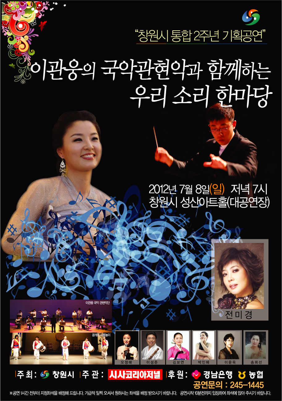 오는 7월 8일 저녁 7시 창원시 성산아트홀 대공연장에서는 통합 창원시 2주년 축하공연 ‘이관웅의 국악 관현악과 함께하는 우리소리 한마당’이 국악인 오정해씨와 함께 화합을 위한 감동의 선율을 선사한다. 이번 행사는 창원시가 주최하고 시사코리아저널이 주관하며 경남은행, 농협, 경남대학교의 후원으로 열린다. 지난 2010년 10월 ..