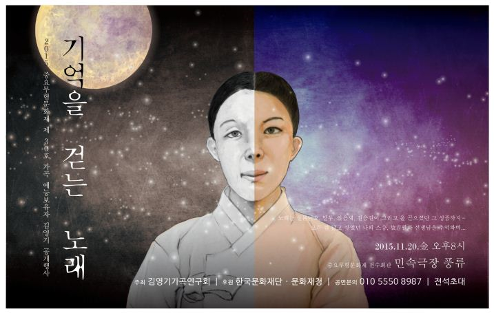 ■ 공연개요 ◾공 연 명 : 2015 중요무형문화재 제30호 가곡 공개행사 기억을 걷는 노래 ◾일 시 : 2015. 11. 20 (금) 20:00 ◾장 소 : 중요무형문화재 전수회관 민속극장 풍류 ◾출 연 : 김영기(중요무형문화재 제30호 가곡예능보유자), 중요무형문화재 제30호 가곡 이수자 및 전수자와 문하생, 음악동인 고물 ◾후 원 : 한국..