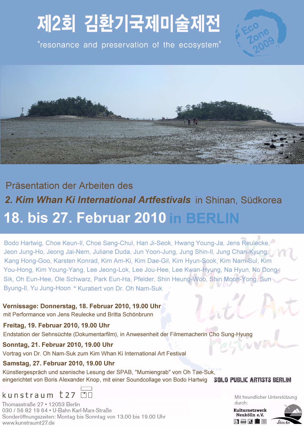 김환기선양사업회가 주최하는 제2회 김환기국제미술제전 광주 갤러리 롯데전과 서울 갤러리 이앙전에 이어 마지막 전시회로 예정된 해외 순회전이 2월 18일부터 27일까지 독일 베를린 갤러리 Kunstraum T 27에서 개최된다. 베를린 순회전은 35명의 국내전 참여 작가들의 출품작으로 구성되며, 해외 운송이 불가능한 대형 설치미술 작품 몇 점은..