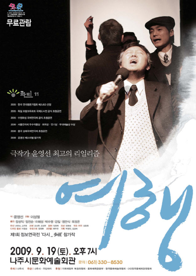 2009. 9. 19(토) 저녁 7시에 나주문화예술회관에서는 연극 “여행”이 공연될 예정이다. 이 공연은 40대 후반 친구들의 이야기로 일상적인 삶을 살고 있던 친구들이 장례식장에서 겪게 되는 하룻밤 여행으로 치밀한 구성과 감칠맛 나는 대사 바로 우리들 삶의 내용이 그대로 그려진다. 이번 공연은 라이브로 기타 등 악기를 연주하는 등..