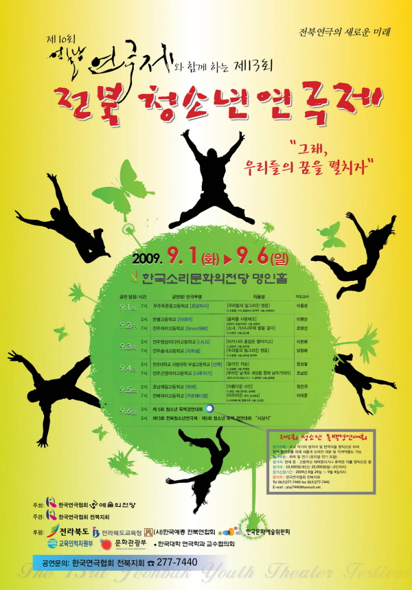 9월의 첫째 주 전북 전주에서는 풍성한 연극잔치가 연이어 펼쳐진다. ‘제10회 영호남 연극제’와 ‘제13회 전북청소년연극제’가 한국소리문화의전당 일원에서 동시에 진행되는 것.먼저, 영ㆍ호남 연극제는 지난해까지는 양 지역 간 친선과 우정, 화합을 위해 전남 순천과 경남 진주에서 격년제 형식으로 치러지던 행사였다.그러..