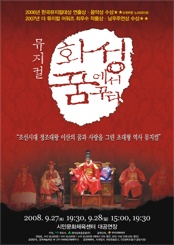 - 9월 27일부터 9월 28일까지 목포시민문화체육센터 대공연장에서 공연- 한국뮤지컬대상 연출상 등 한국을 대표하는 우수 창작 뮤지컬 목포시에서는 문화예술 향연의 계절 가을을 맞이하여 대형 역사 뮤지컬인『화성에서 꿈꾸다』를 유치하여 오는 9월 27일 부터 9월 28일 총 3회에 걸쳐 시민문화체육센터 대공연장에서 공연하게 된다. 본 공연은 유네..